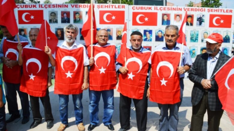 Çubuk İlçesi Terör Mağdurları Dayanışma Derneği ile Çubuk Kent Konseyi tarafından organize edilen protesto gösterisi istiklal marşı, saygı duruşu ve Kuran Tilaveti ile başladı.