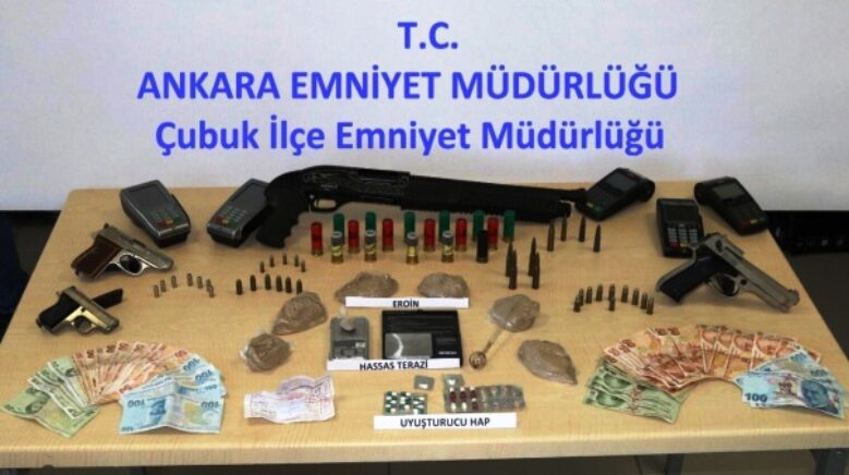 Sabahın erken saatlerinde özel harekât ve narkotik birimlerinin de katılımıyla eş zamanlı operasyonda yapılan aramada, 320 gr eroin, 23 gr bonzai, 26 adet uyuşturucu hap, 2 adet hassas terazi, 1 adet ruhsatsız av tüfeği, 17 adet av tüfeği mermisi, 2 adet kuru sıkı tabanca, 2 adet tabanca, 29 çeşitli çapta mermi ve 2,250 TL para ele geçirildi.